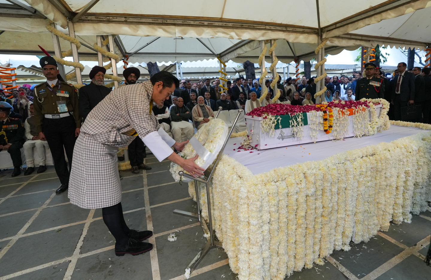 དེ་ཡང་ མི་དབང་མངའ་ཞབས་མཆོག་གིས་ ཕྱག་ཤུལ་ཅན་གྱི་ དབུ་ཁྲིད་ཨིན་མི་ འབྲུག་གི་ཆ་རོགས་འཆམ་ཤོས་ ཌོག་ཊར་སིང་གི་ སྐུ་ཕུང་ལུ་ མེ་ཏོག་གི་ཕྲེང་བ་ ཕུལ་གནང་ཡོདཔ་ད་ མི་དབང་མཆོག་ དེ་བཟུམ་མའི་ སྤུར་སྦྱང་ནང་ ཆིབས་བསྐྱོད་གནང་པ་ལུ་བརྟེན་ཏེ་ འབྲུག་དང་ རྒྱ་གར་གྱི་བར་ན་ མཐུན་ལམ་གཏིང་ཟབ་དང་ ཡུན་བརྟན་ཡོད་མི་འདི་ ཧེང་སྐལ་རང་ དམ་ཟབ་སོང་ནུག།