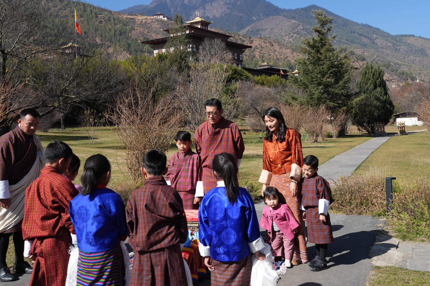 སྤྱི་ཟླ་ ༡ པའི་ཚེས་ ༢ ལུ་ ཐིམ་ཕུའི་སློབ་ཕྲུག་སྡེ་ཚན་ཅིག་གིས་ མི་དབང་མངའ་བདག་རིན་པོ་ཆེ་དང་ མི་དབང་རྒྱལ་བཙུན་མཆོག་གིས་ དབུ་གཙོས་པའི་ མི་དབང་རྒྱལ་སྲས་ འཇིགས་མེད་རྣམ་རྒྱལ་དབང་ཕྱུག་དང་ མི་དབང་རྒྱལ་སྲས་ ཨྱོན་དབང་ཕྱུག་ མི་དབང་རྒྱལ་སྲསམོ་ བསོད་ནམས་གཡང་སྒྲོན་དབང་ཕྱུག་ཚུ་གི་ སྐུ་མདུན་ལུ་བཅར་ཏེ་ ལོ་ལེགས་བགྱངས་ཐོག་ལས་ ཉི་ལོག་བརྩི་སྲུང་ཞུ་ཡི།