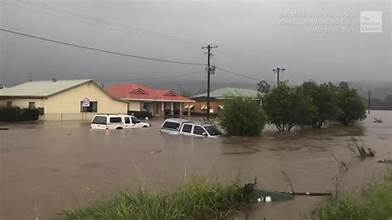Video has emerged showing a man clinging to a pole in Ingham after his vehicle was washed away – and being taken to safety by locals in a boat.