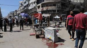 At least 20 Palestinians have been killed in two Israeli strikes on a crowded restaurant and market on the same street in Gaza City, medics say.