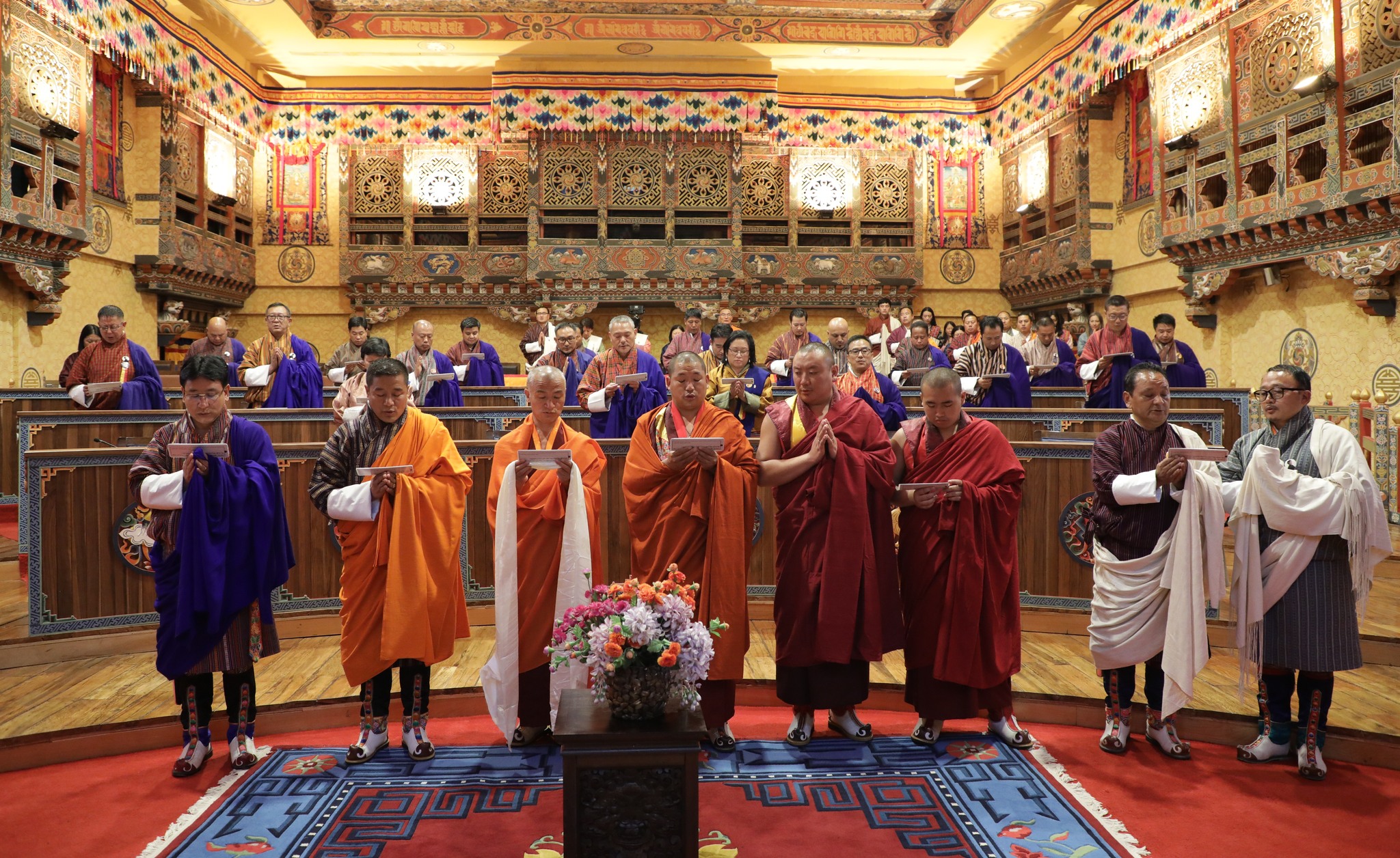 མཇུག་བསྡུའི་རྟེན་འབྲེལ་ནང་ མི་རྗེ་བློན་ཆེན་དང་ ཚོགས་དཔོན་ ལྷན་རྒྱས་གཞུང་ཚོགས་ཀྱི་ བློན་པོ་ཚུ་གིས་གཙོས་པའི་ ཆེ་མཐོའི་དཔོན་ཁག་ཚུ་གིས་ གྲལ་གཏོགས་མཛད་ཡོད་པའི་གནས་ཚུལ།
