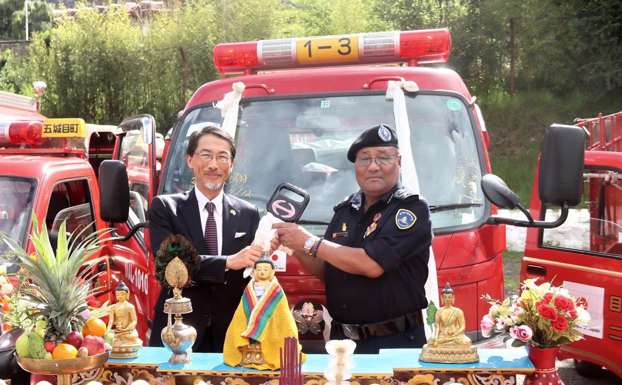 འབྲུག་དང་ རྒྱ་པཱན་གྱི་བར་ན་ མཐུན་ལམ་འཕྲོ་མཐུད་ཡོད་པའི་ བརྡ་མཚོན་ལུ་ འབྲུག་ནུབ་ཕྱོགས་ཀྱི་དོན་ལས་ བསྐྱར་བཅོས་ཐོག་གི་ མེ་རྐྱེན་ཉེན་སྲུང་སྣུམ་འཁོར་ལས་འགུལ་འོག་ལས་ རྒྱ་པཱན་གཞུང་གིས་ རྒྱལ་གཞུང་འབྲུག་གི་དགག་སྡེ་ལུ་ མཁོ་བྱད་ཀུན་ཚང་གི་ མེ་རྐྱེན་ཉེན་སྲུང་སྣུམ་འཁོར་ ༥ ཞལ་འདེབས་སྦེ་བྱིན་ནུག།