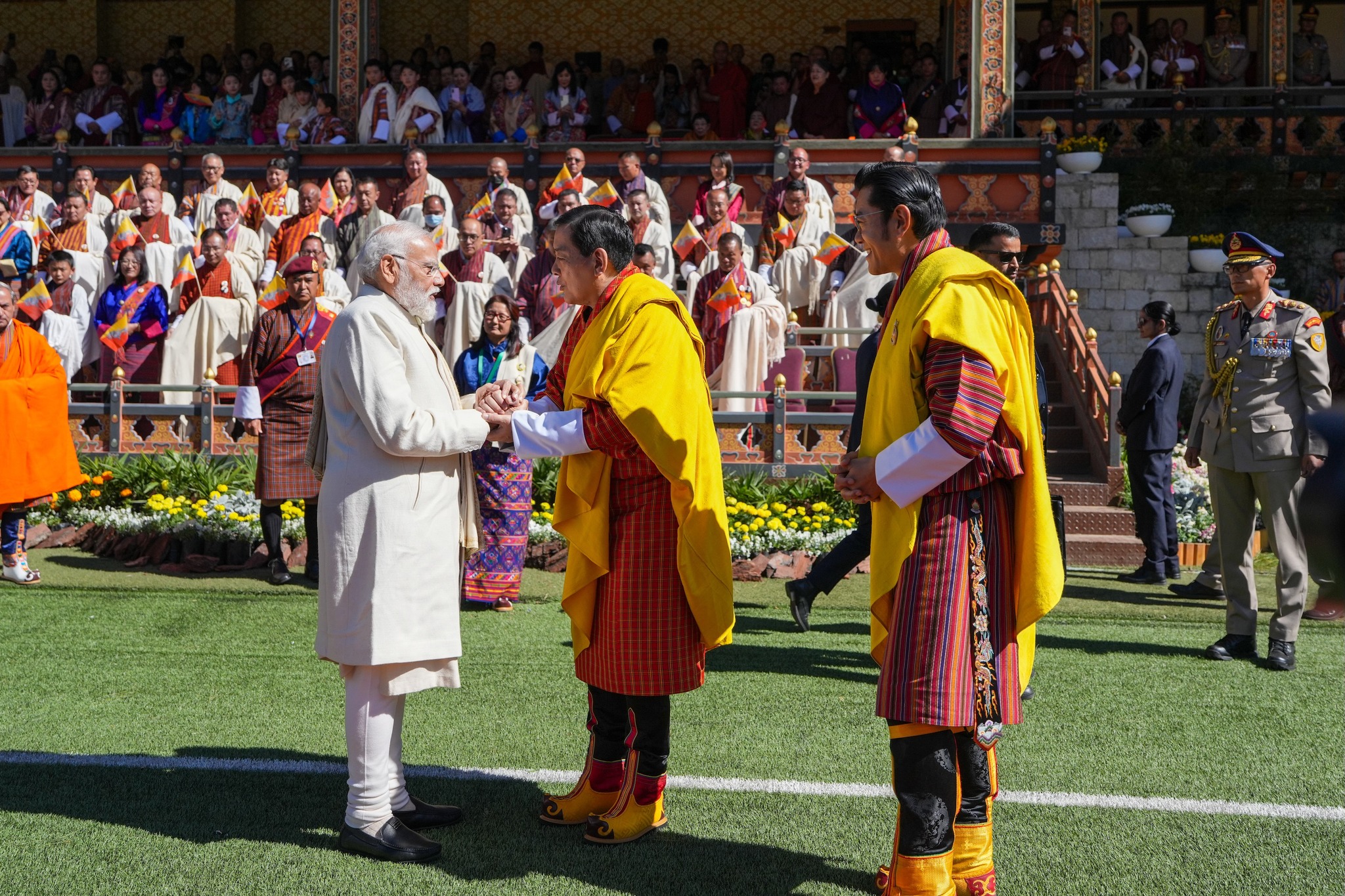 མི་དབང་མངའ་བདག་རིན་པོ་ཆེ་ དཔལ་འཇིགས་མེད་གེ་སར་རྣམ་རྒྱལ་དབང་ཕྱུག་མཆོག་གིས་ མགྲོན་བརྡ་གནང་ཡོདཔ་བཞིན་དུ་ རྒྱ་གར་གྱི་བློནཆེན་ ན་རེན་ད་ར་ མོ་དི་མཆོག་ སྤྱི་ཟླ་ ༡༡ པའི་ཚེས་ ༡༡ ལས་ ༡༢ ཚུན་ ཉིན་གྲངས་ ༢ ཀྱི་དོན་ལས་ འབྲུག་ལུ་ གཞུང་འབྲེལ་གཟིགས་སྐོར་གནང་པར་བྱོན་ཡི།
