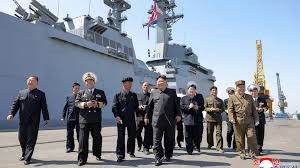 The Korean Central News Agency, another state outlet, published photos of Kim and other senior officials watching from a pier as a projectile trailed gray smoke while arcing away from the warship.